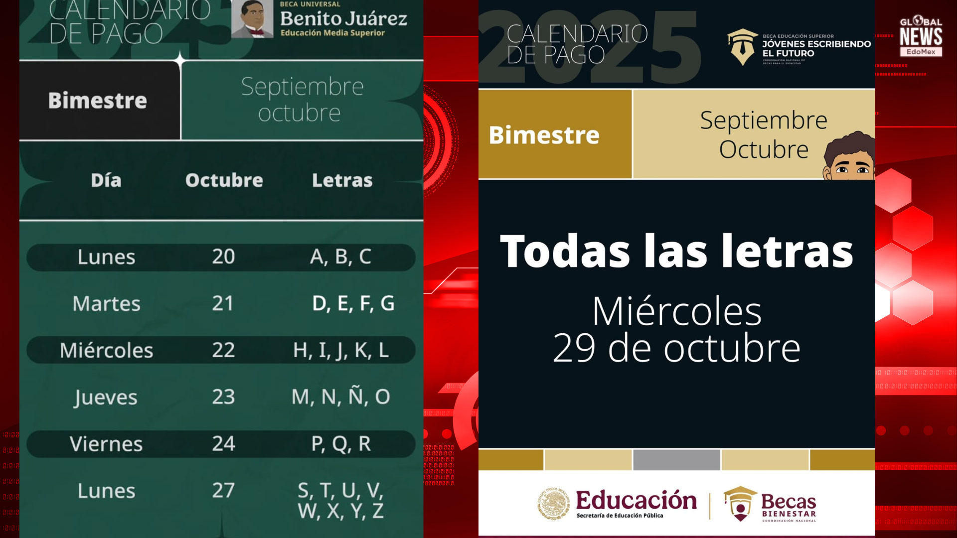 TOLUCA, Estado de México.— El Gobierno del Estado de México, encabezado por la Maestra Delfina Gómez Álvarez, en coordinación con la Coordinación Nacional de Becas para el Bienestar Benito Juárez (CNBBBJ), exhorta a las y los estudiantes mexiquenses a consultar el calendario de pagos correspondiente al cuarto bimestre de 2025 (septiembre-octubre) de los programas Beca Universal Benito Juárez y Jóvenes Escribiendo el Futuro, disponible en www.gob.mx/becasbenitojuarez.